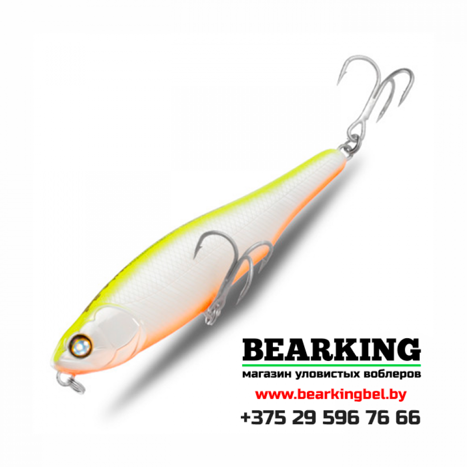 BearKing Black Powder 87F Цвет B (реплика на Whiplash Factory Valley Hill Live Wire Pencil 87F) имеет длину 87 мм, вес 9,2 грамма, заглубление от 0 до 0.1 метра. Тип плавучести - плавающий (floating). Тип воблера - волкер (walker).
