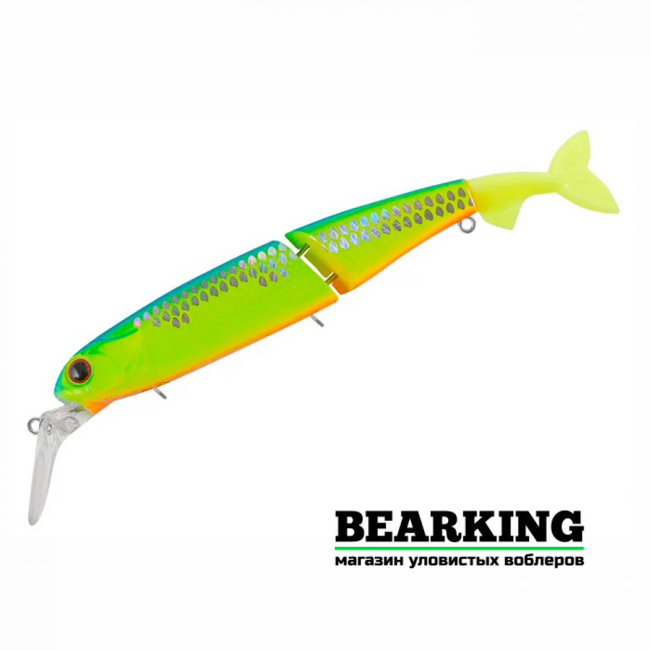 Начать обзор приманки стоит с внешнего вида. TsuYoki Witch 118SP имеет две отдельные части, которые скреплены между собой специальными кольцами. Именно из-за такого решения, во время проводки, каждая секция будет двигаться отдельно, создавая впечатление действительно живой рыбки. Лопатка расположена фактически под прямым углом вниз и немного выступает за рамки головы. По всей области имеются рельефные насечки, которые напоминают чешую. Спинка и брюшко гладкие. Глаза будто настоящие, поэтому у хищника и вовсе не возникнет никаких подозрений. Отдельного внимания требует хвостик, который изготовлен из силикона и чем-то напоминает щучий, такой же разветвленный и широкий.