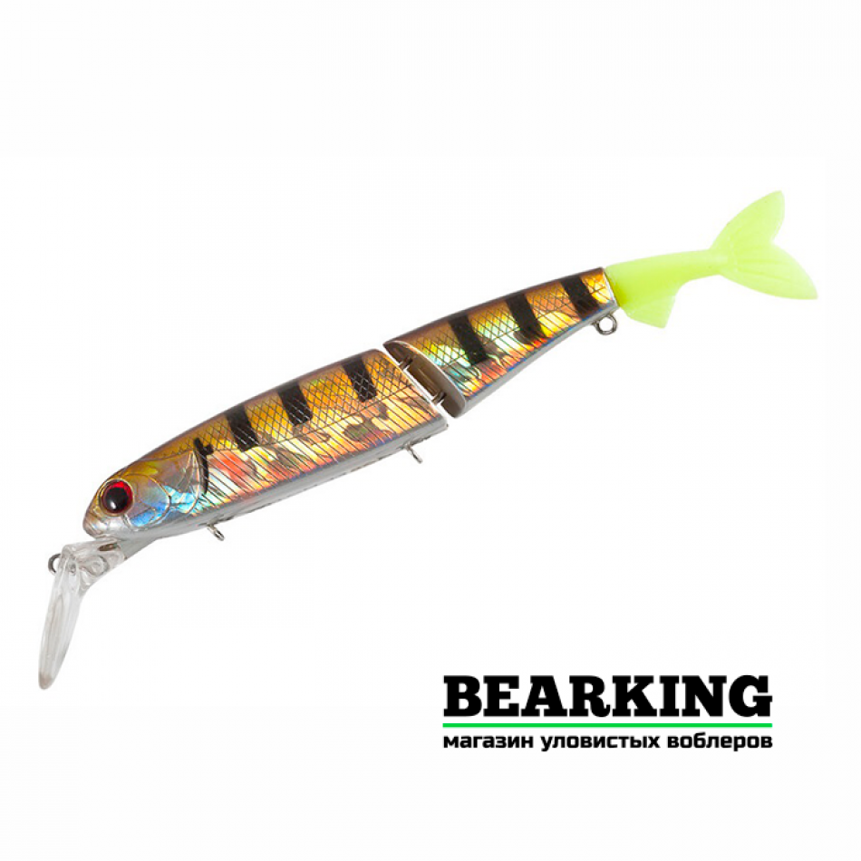 Начать обзор приманки стоит с внешнего вида. TsuYoki Witch 118SP имеет две отдельные части, которые скреплены между собой специальными кольцами. Именно из-за такого решения, во время проводки, каждая секция будет двигаться отдельно, создавая впечатление действительно живой рыбки. Лопатка расположена фактически под прямым углом вниз и немного выступает за рамки головы. По всей области имеются рельефные насечки, которые напоминают чешую. Спинка и брюшко гладкие. Глаза будто настоящие, поэтому у хищника и вовсе не возникнет никаких подозрений. Отдельного внимания требует хвостик, который изготовлен из силикона и чем-то напоминает щучий, такой же разветвленный и широкий.